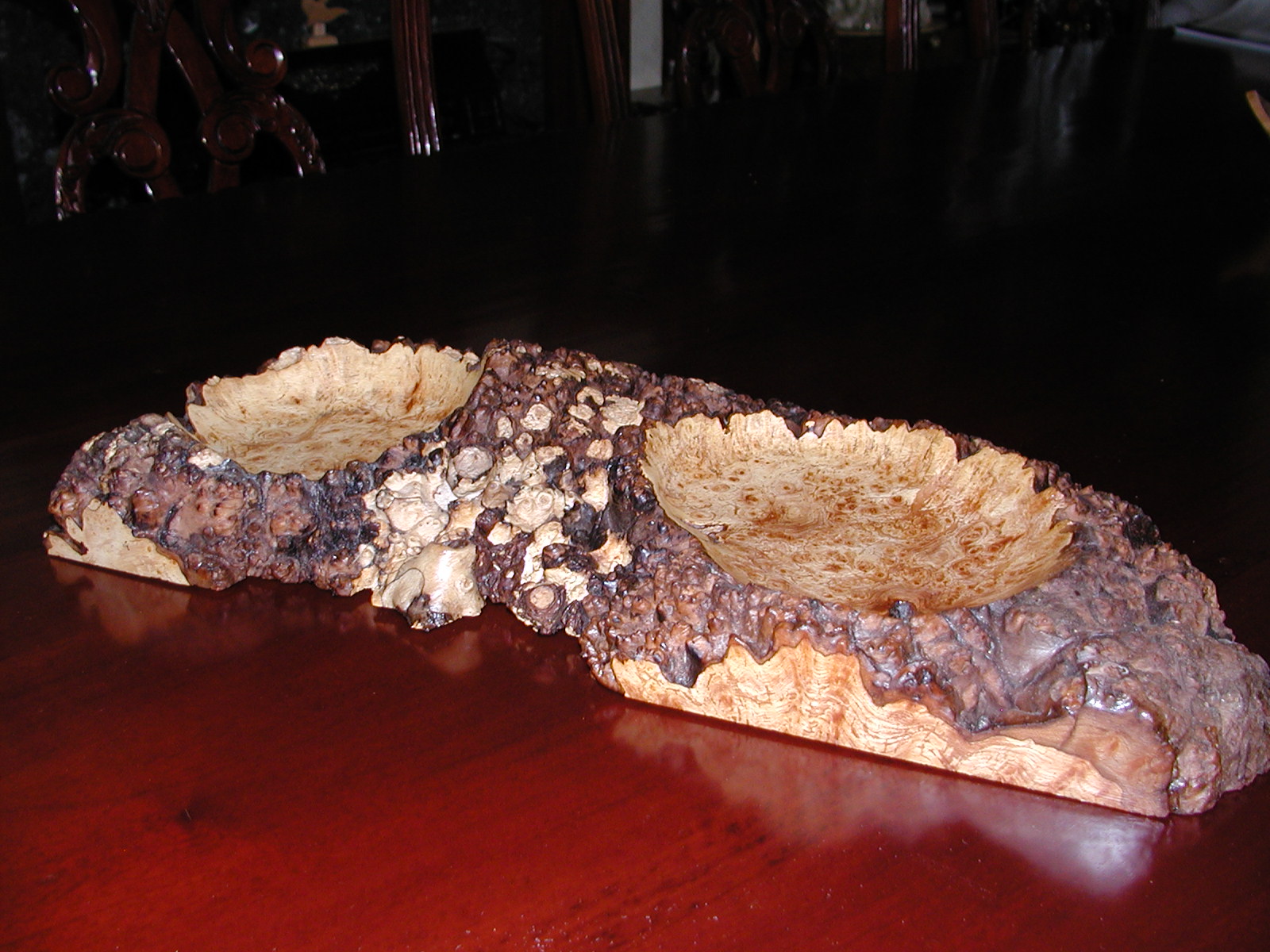 Choices here can range from a single small offset as in the palm bowl on the left (offset of about a quarter of an inch) to the burr elm piece on the right with two separate bowls inset about 6 inches apart.